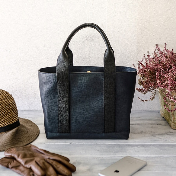 ※こちらのページでのご注文は本体ネイビー、ハンドルブラックカラーになります。 「トートバッグ」のデザイン性をシンプルに表現しました。 マチが広めのデザインで内側ポケットを充実、見た目以上の収納力をこのコストパフォーマンスでお届けします。 本作品は内側の収納スペースにこだわりました。 マチが広と収納物が中で暴れたり、立てて入れたものでも倒れてしまったり。。。 そんな状態を軽減するために内側四方にマチのついた大,小のポケットを付けました。 分別整理収納することができ使いやすさに人気の逸品です。 全てにしっかりした上質シュリンクカウレザー仕様です。 持ち手や天部分の裁断面を美しく仕上げるためにコバ塗りを複数回、時間をかけ丁寧に仕上げております。全ての切り目部分はコバ塗り加工を施しております。 革の程よい弾力性と、細部にまでこだわったシンプルな「創り」に高級トートバッグを感じていただけます。 【素材】 本体と内側ポケット:シュリンクレザー(本革) 【サイズ】 本体 : 縦22 x 横28(底) x マチ15cm(約) 持ち手立ち上がり 15cm (本体の天部分から、持ち手の最上部(内側)までの長さ) 内側ファスナーポケット (皮革)入れ口 24 x深さ14cm (約) x2ヶ 内側マチオープンポケット(皮革)色サーモン 入れ口 9 x深さ12cm (約) x2ヶ 【ショルダーストラップ/同時購入オプション+¥8800】 ショルダーストラップ:持ち手立ち上がり約38~70cm(無段階調整可)幅2cm ※ご購入時に同時購入オプションよりご選択ください。 【在庫状況 & 納期のついて】 ご注文を頂いてから丁寧に製作するため、7日前後の制作期間を頂いております。(祝祭土日を除く) ●ラッピング(有料)は簡易ラッピング袋を同封させて頂きますので、お手数ですがラッピングはお客様でお願い申し上げます。 ※製作が込み合っている場合は出荷が数日遅れることがございます。 ※年末年始及び大型連休のお届けに関しましては[プロフィール]ページをご覧下さいませ。 ・こちらの商品を使用中に起きた入れ物への破損や汚れ怪我などは一切責任を負いませんので予めが了承ください。 ・紹介写真と一部仕様が変わることがございます。天然素材の皮革ですので裁断箇所によって柄が写真とは異なることがございます。予めご了承ください。 (品質レベルを下げる事はございません) 実際の色目と差がないように調整しておりますが、モニターの環境によって実際の色目と異なることがございます。予めご了承ください。 |