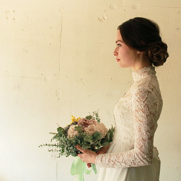 総レースでお作りしたハイネック襟タイプのウエディングボレロです。 前がくるみボタンになっていて露出が限りなく抑えられ清楚。 こちらのレースは華やかなレティチェラレース総レースで しっかりしており美しく大人っぽい仕上がりで人気です。 ※画像のドレスとセットでのご販売も可能です。(ドレス69800円) またお色直しでのイメージチェンジにも人気です♪ ■サイズは7号から11号程度のかたにちょうどいいフリーサイズ ご身長155cm前後から170cm前後の方に最適 ※サイズ感心配な方はご身長とバストサイズ、ドレスの種類等をご相談下さい。 サイズ変更は有料です このボレロはただ今オーダーサイズは受けておりません。 袖のカットなどは別料金で直せます。 どうぞメッセージでお気軽にご相談下さいませ。 ※お取引連絡は発送日または前日になる事もございますのでご了承下さいませ。 ※ご使用のPcブラウザによってはカラーなど若干見え方が異なる場合も ございますのでご注意下さい ※大型連休の際の発送や返品交換などに関しましてはプロフィールをご覧ください。