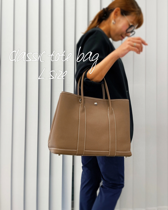 人気カラーのブラウングレーが販売です 安心感ある人気の牛革製トートバッグに以前大変好評いただきましたLサイズが数量限定で復活です。 物を出し入れしやすいシンプルなデザインで扱いやすさは抜群です。通勤や通学などのスタイルにもぴったり! もちろん!普段使いにも大人カジュアルにお使いいただけます。 荷物の多い方にも嬉しい収納力。 軽い一泊くらいならいけそうです(^^) 丈夫で高級感ある牛革素材を使用しています☆ 内側大きめのファスナーポケット付き 内側の生地と同素材のファスナー付きポーチもお付けします。 ※こちらのLサイズはショルダー無しです※ 【サイズ】 W35(ボタンを外して横長の時46センチ) ×H26×D17 センチ ハンドル高さ 15センチ 【重量】バッグ本体 約950g 【付属品】布製ポーチ 【本体価格】¥17,000-+tax ※チャームは別売りです